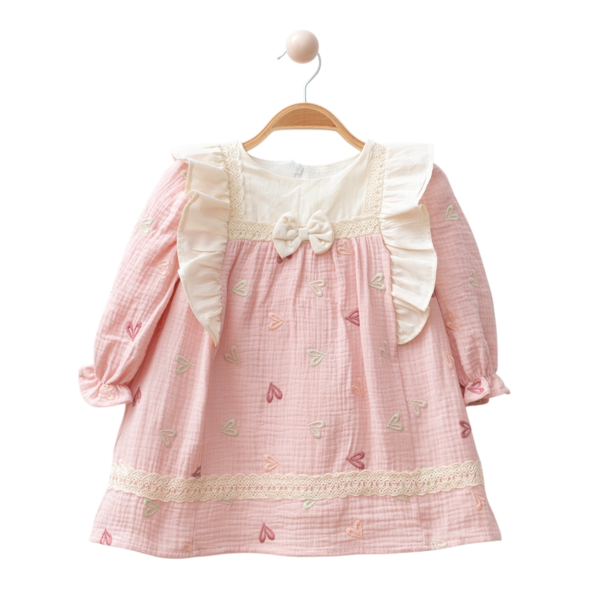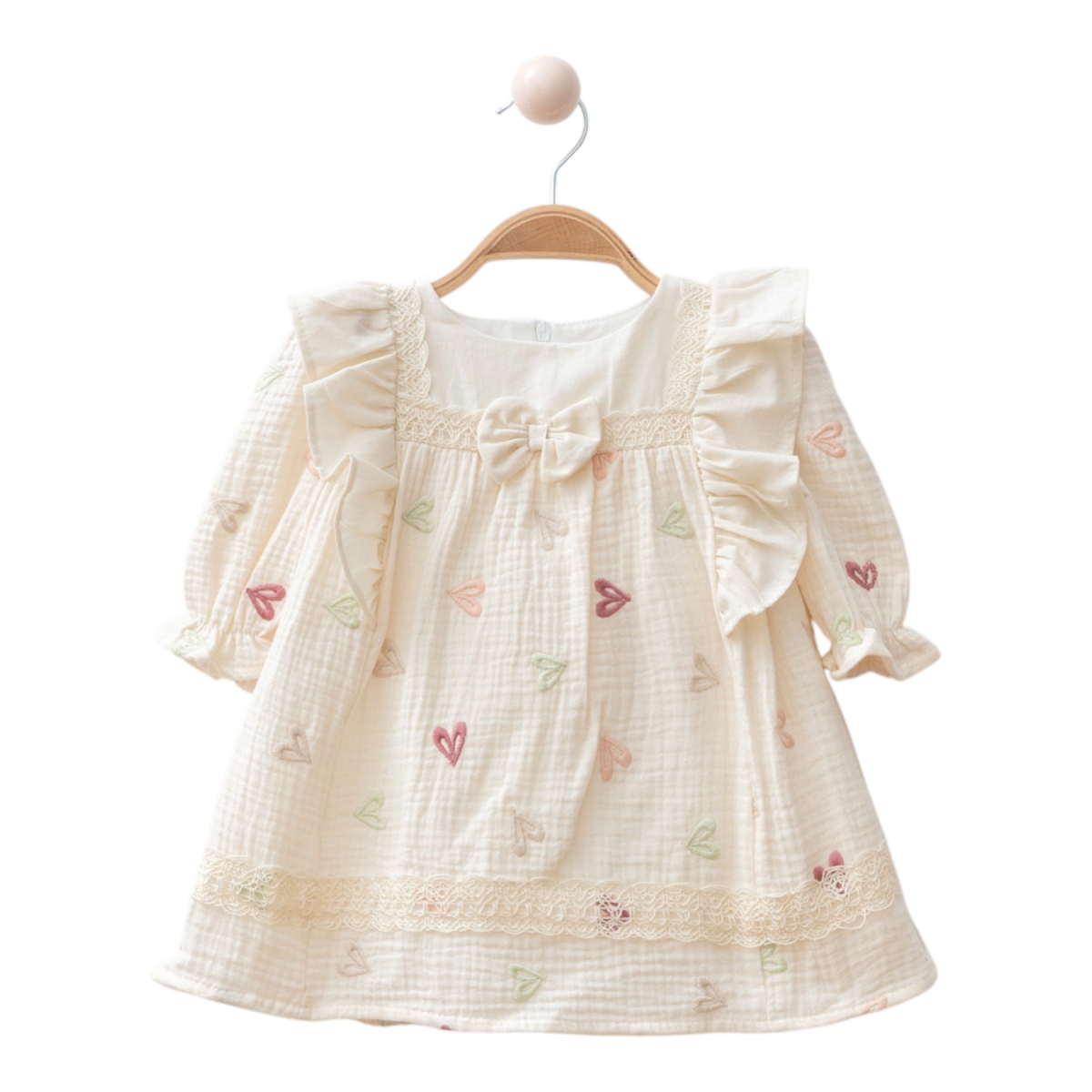 Yumuşak pamuk kumaştan üretilmiş bebek elbisesi, sıcak tonlarda işlenmiş sevimli kalp desenleriyle süslenmiştir. Ön kısmındaki fiyonk detayı ve zarif pileli yapısıyla minik prensesinize kraliçelere layık bir şıklık kazandırır.